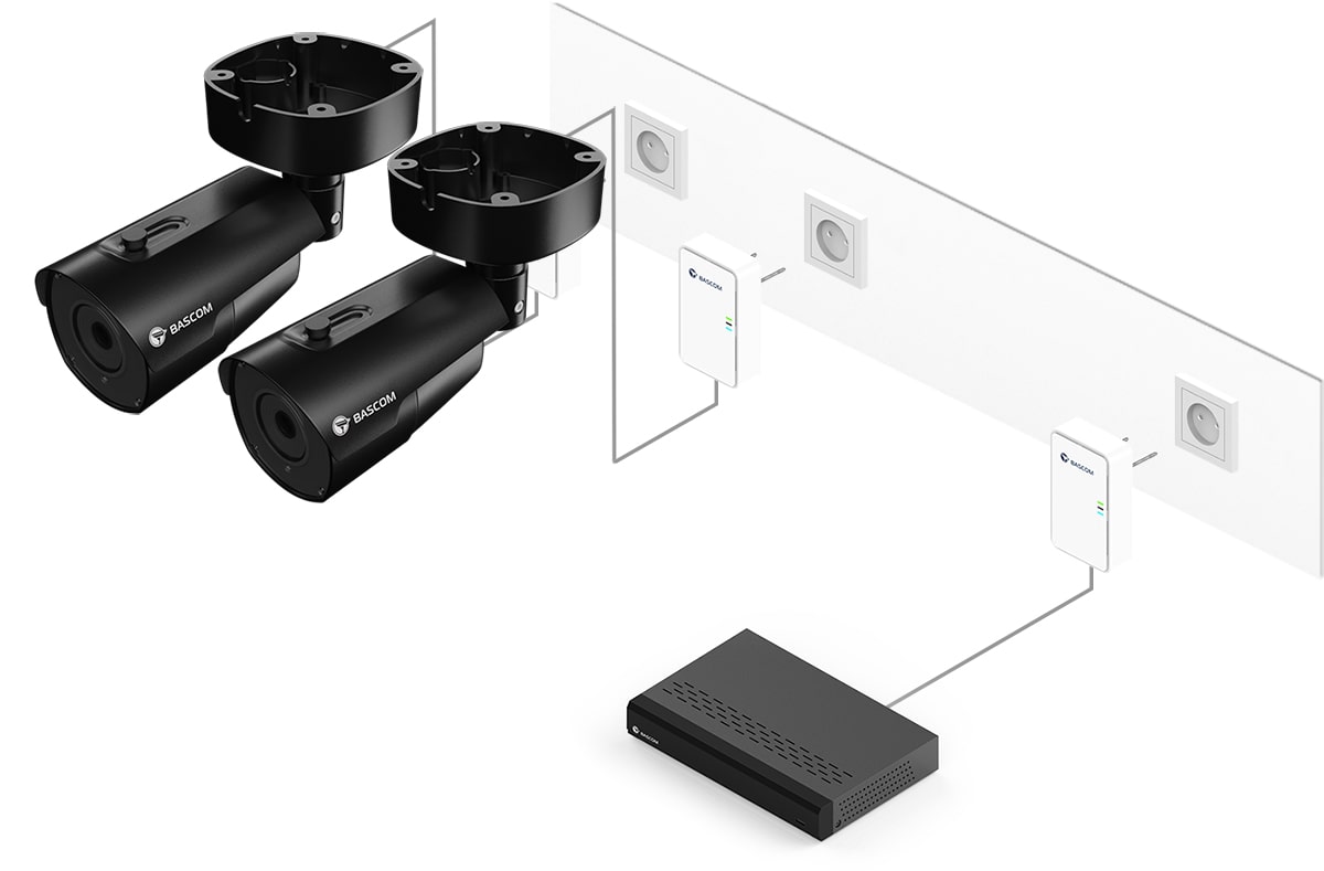 Professional CCTV system consisting of 2 powerline security cameras and a 4-channel recorder (space for an additional 2 cameras). Designed for easy self-installation; you’ll receive a complete kit, including the Bascom smartphone app.